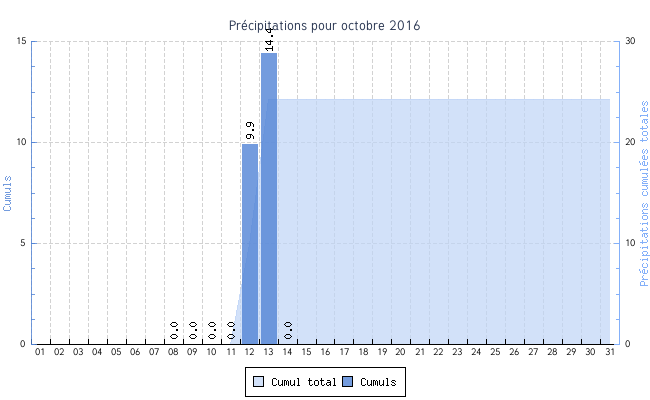 | Jour | Température | Vent | Pluie | |||