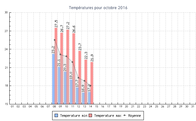 | 14 | 17.0 °C | 21.9 °C | 18.0 °C | 0.7 km/h (10.0 km/h) | N |
